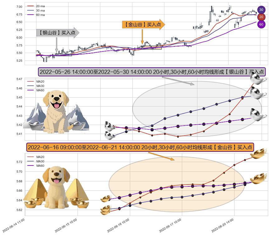 ⚂ 2022-06-16 10:00:00-小时至2022-06-21 14:00:00-小时显现 20小时-30小时-60小时均线 【金山谷】买入点 其再次确认了买入信号,可靠性更强,买入