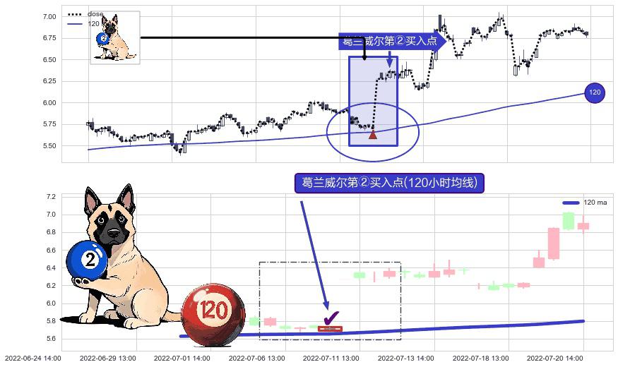 ⚀ 2022-07-07 14:00:00-小时显现 葛兰威尔均线 120小时均线 第②买入点 上升趋势的中继信号,后市看涨,买进信号