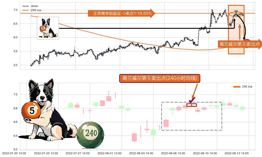 ⚀ 2022-08-08 14:00:00-小时显现 葛兰威尔均线 240小时均线 第⑤卖出点 上升趋势均值回复的短线回落信号,后市看跌,卖出信号