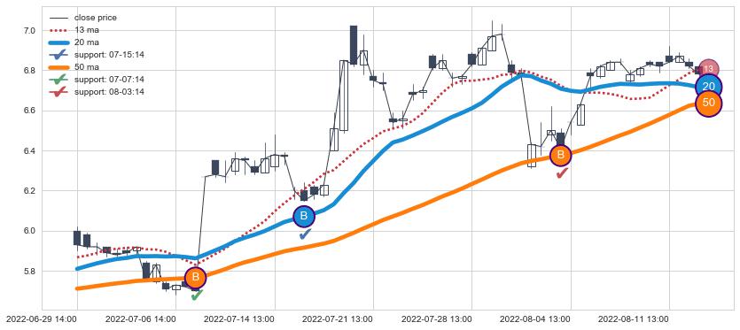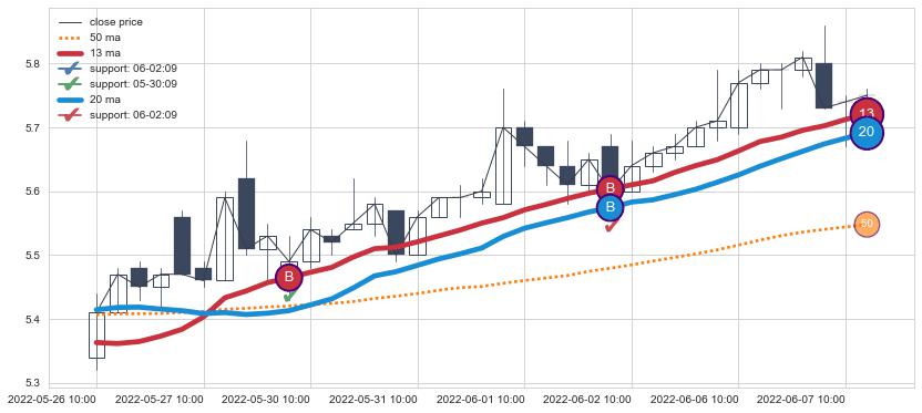 ⚂ 2022-06-14 09:00:00-小时均线向下破位,2022-06-14 13:00:00-小时重新上穿突破均线,均线支撑再次生效