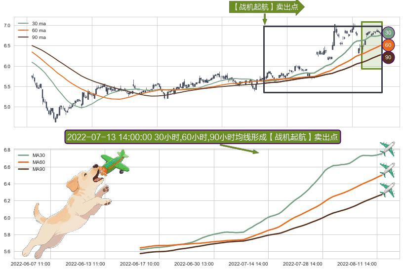 ⚀ 2022-06-15 14:00:00小时-2022-08-12 14:00:00小时显现 30小时-60小时-90小时均线 【战机起航】卖出点 看空信号,后市看跌,卖出