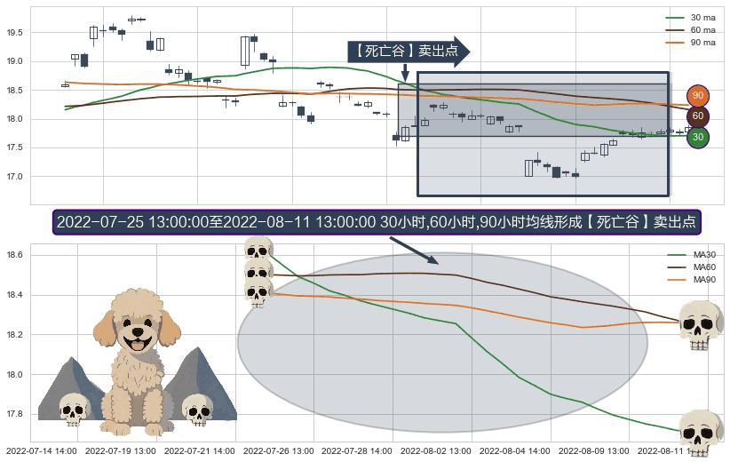 形态多维评估: ⚀ 2022-07-25 14:00:00-小时至2022-08-11 13:00:00-小时显现 30小时-60小时-90小时均线 【死亡谷】卖出点 看空信号,后市看跌,卖出