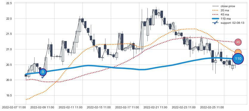 上涨趋势02-07 11:00-02-28 10:00,均线110确认关键支撑1处