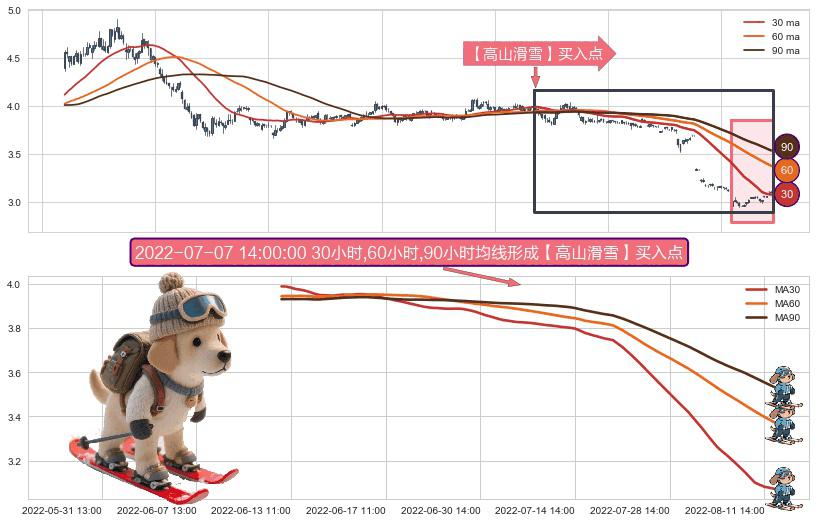 形态多维评估: ⚀ 2022-06-13 09:00:00小时-2022-08-12 14:00:00小时显现 30小时-60小时-90小时均线 【高山滑雪】买入点 看多信号,后市看涨,买入