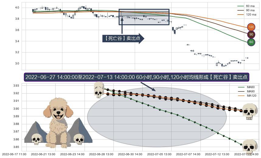 形态多维评估: ⚀ 2022-06-28 13:00:00-小时至2022-07-13 14:00:00-小时显现 60小时-90小时-120小时均线 【死亡谷】卖出点 看空信号,后市看跌,卖出