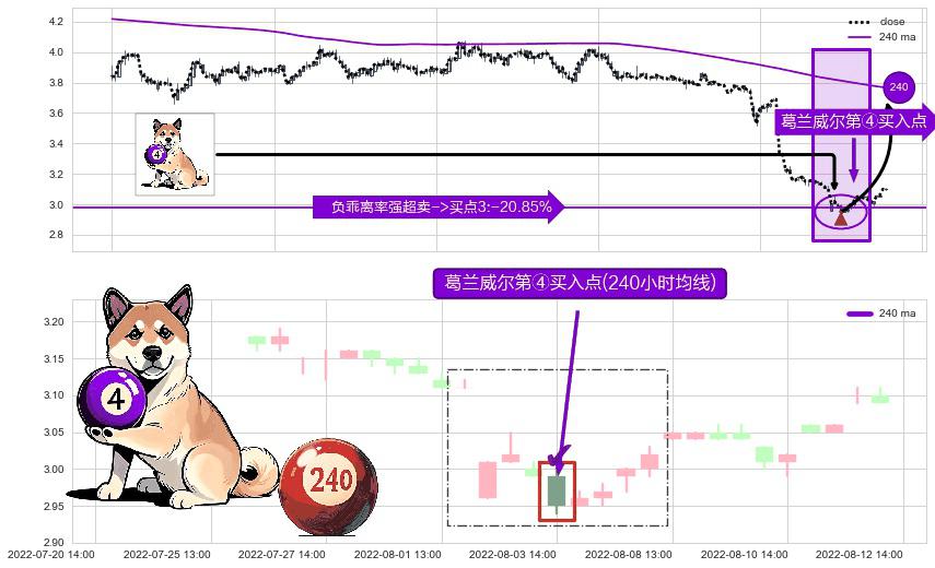 形态多维评估: ⚀ 2022-08-03 14:00:00-小时显现 葛兰威尔均线 240小时均线 第④买入点 下降趋势均值回复的短线反弹信号,后市看涨,买进信号