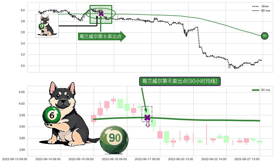 形态多维评估: ⚀ 2022-06-16 13:00:00-小时显现 葛兰威尔均线 90小时均线 第⑥卖出点 走势反转见顶信号,后市看跌,卖出信号