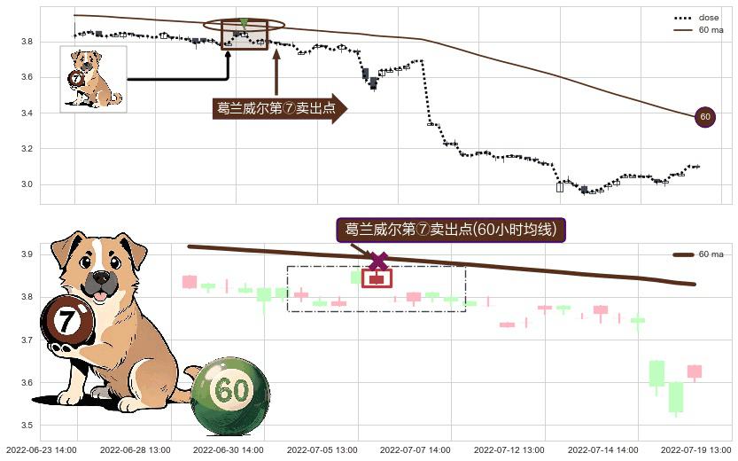 形态多维评估: ⚀ 2022-07-05 14:00:00-小时显现 葛兰威尔均线 60小时均线 第⑦卖出点 下降趋势的中继信号,后市看跌,卖出信号