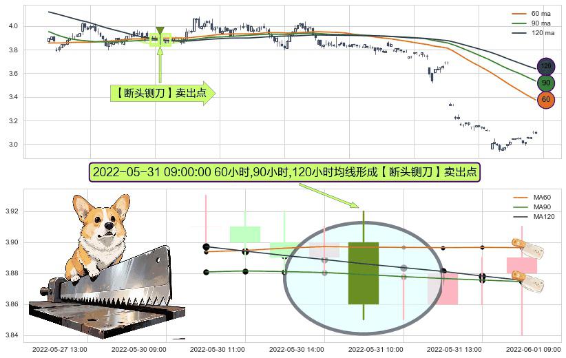 形态多维评估: ⚀ 2022-05-31 09:00:00小时显现 60小时-90小时-120小时均线 【断头铡刀】卖出点 看空信号,后市看跌,卖出