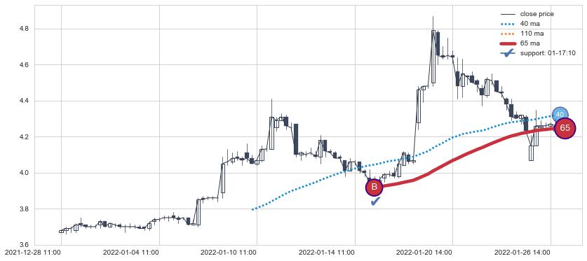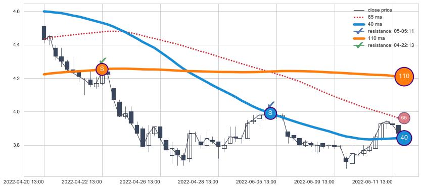 下跌趋势04-20 13:00-05-11 14:00,均线40, 110确认关键阻力2处