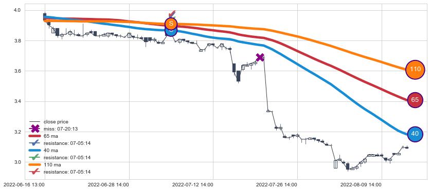 下跌趋势06-16 13:00-08-12 14:00,均线40, 65, 110确认关键阻力1处
