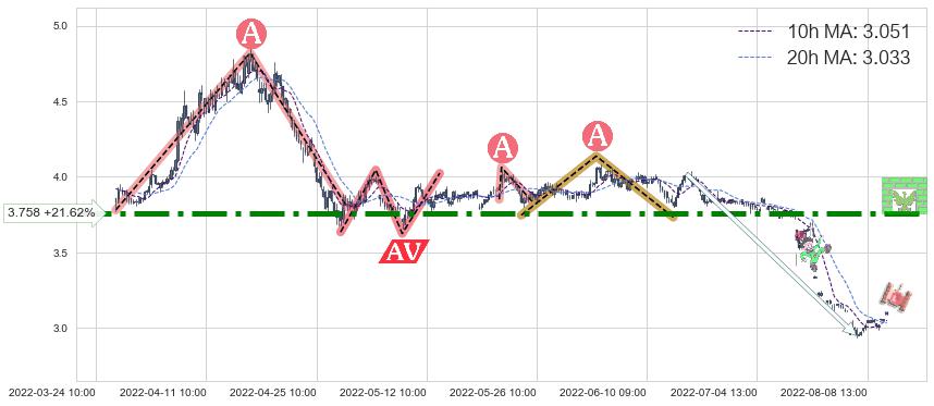 2022-05-19: 第一阻力位3.758有效抑制了下跌浪,成功阻止了价格的继续下跌。