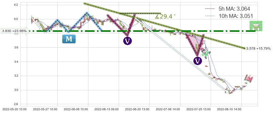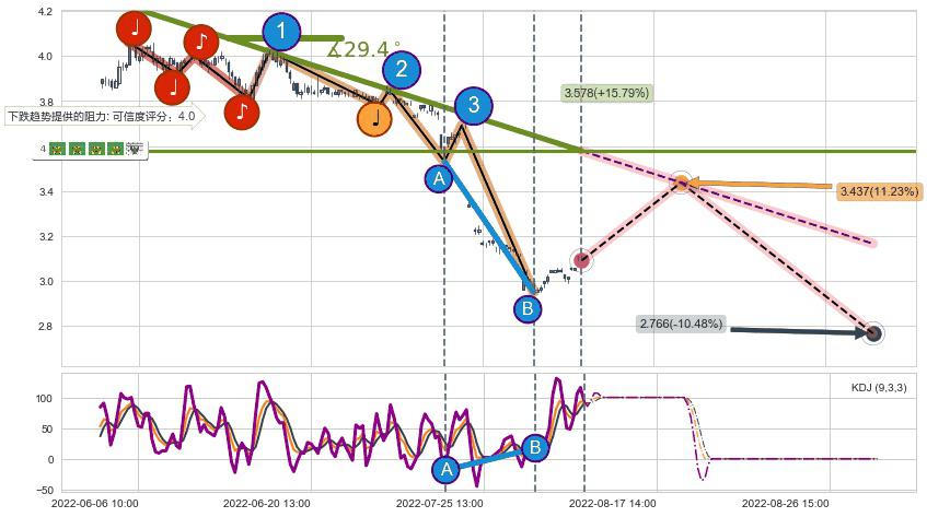 ♘ 阻力价格位3.830,可信任强度99.00%,距离最后交易2022-08-12 14:00形成的收盘价格3.090相差 +23.95%