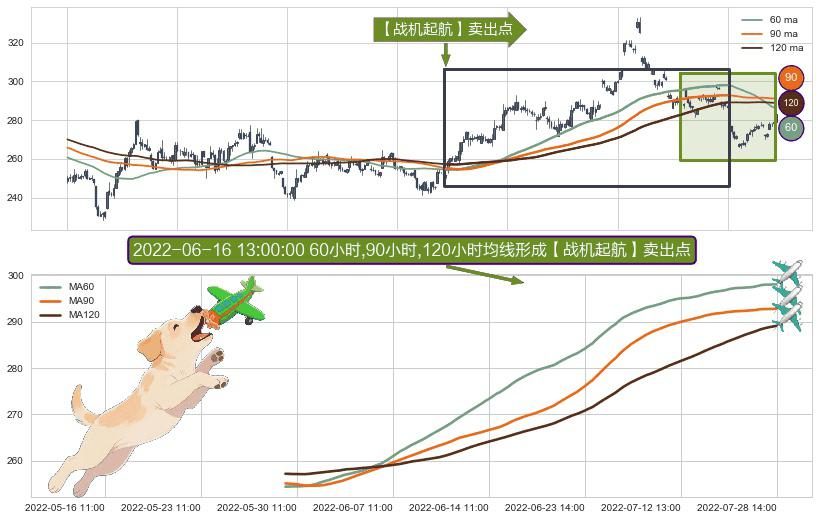 ⚀ 2022-05-27 14:00:00小时-2022-07-28 14:00:00小时显现 60小时-90小时-120小时均线 【战机起航】卖出点 看空信号,后市看跌,卖出