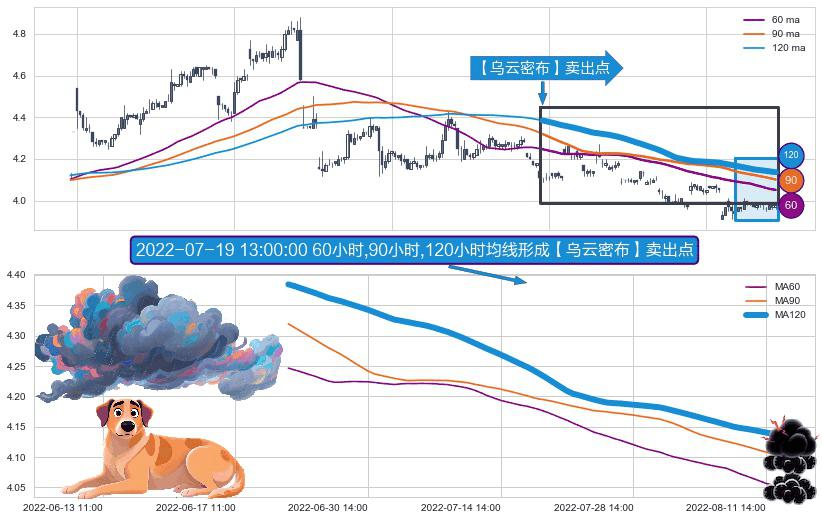 ⚀ 2022-06-22 14:00:00小时-2022-08-12 14:00:00小时显现 60小时-90小时-120小时均线 【乌云密布】卖出点 看空信号,后市看跌,卖出