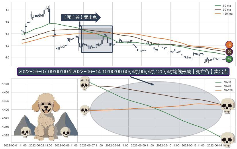 ⚀ 2022-06-07 10:00:00-小时至2022-06-14 10:00:00-小时显现 60小时-90小时-120小时均线 【死亡谷】卖出点 看空信号,后市看跌,卖出
