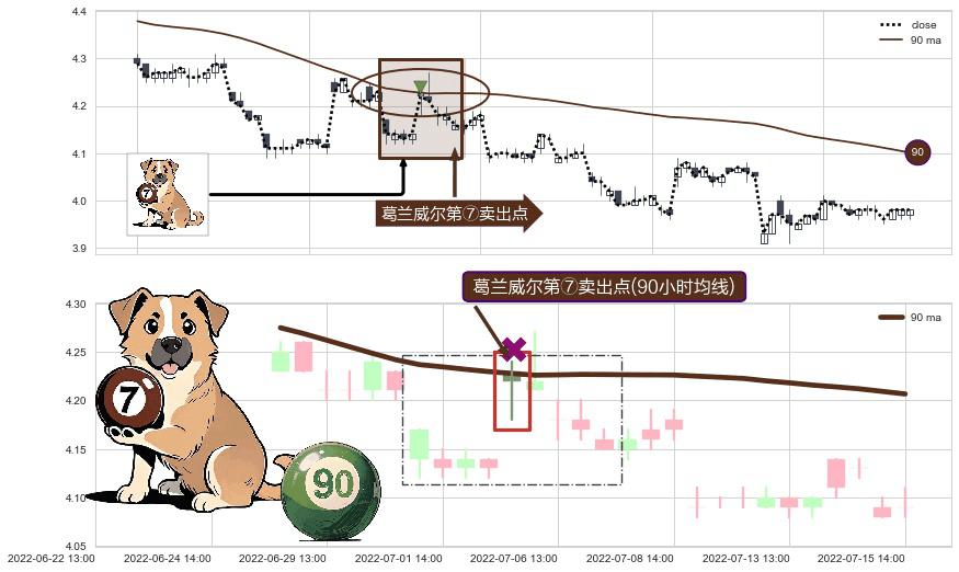 ⚀ 2022-07-05 13:00:00-小时显现 葛兰威尔均线 90小时均线 第⑦卖出点 下降趋势的中继信号,后市看跌,卖出信号
