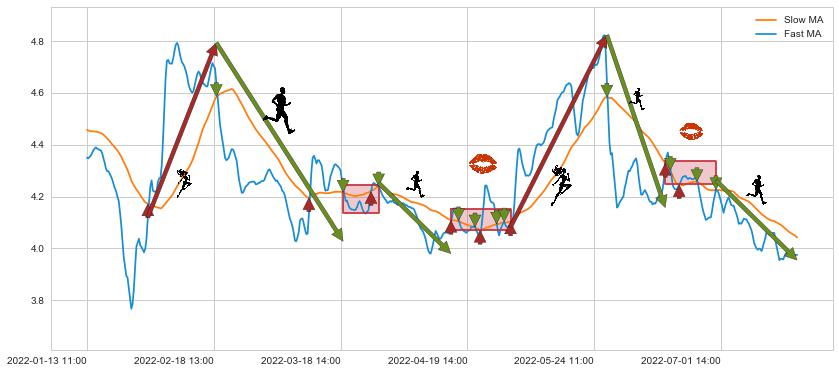 03-21 10:00至03-28 14:00 慢线与快线多次接触,存在上下穿越,有缠绕