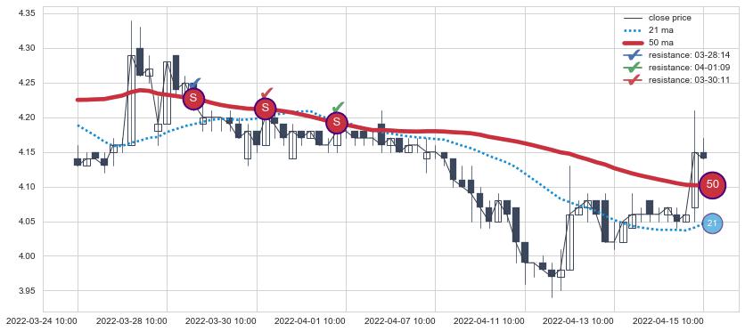 ⚂ 第⑦卖出点 刚刚再次反弹均线向下回落, 阻力 效果并未十分稳固,属于【激进】的卖出信号,高时效看空信号