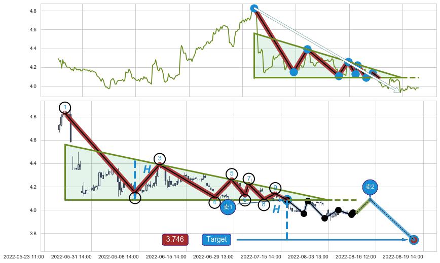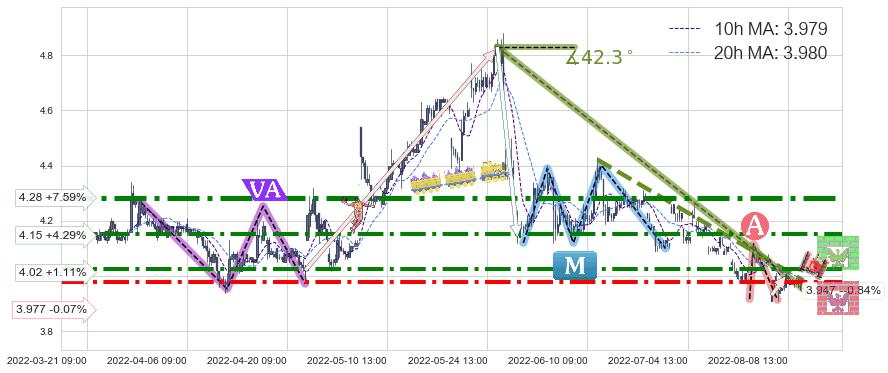 ➢ 【已确认突破】最后价格:3.980与最小【整理】第一目标价格→(08-19:14: 3.746 )相较: 下跌空间【中等】