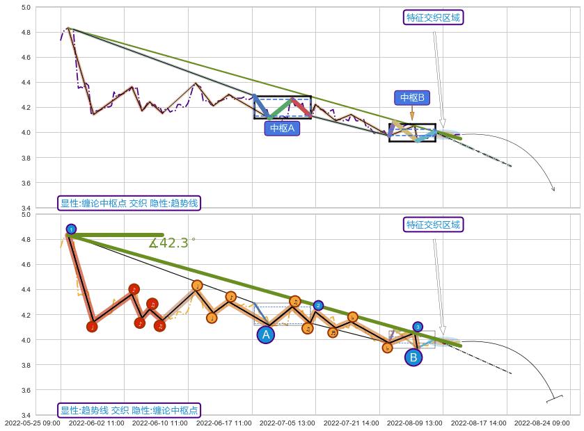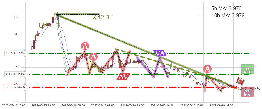 🦴 长线均值回复组合短线趋势跟踪[强阻力信号]2022-05-25 13:00-2022-08-05 14:00下跌趋势依然成立(下跌趋势跟踪依然存在),短线价格略微上行反弹(均值回复猜想),即将接近下跌趋势提供的未破位阻力价格:3.947。