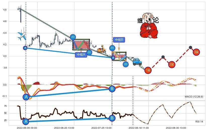 ♘ 在最后的下跌阶段2022-05-25 13:00至2022-08-05 14:00,存在 破位边缘的阻力位 ,阻力价格3.947,可信任强度69.39%,其距离最后价格3.980相差 -0.84%