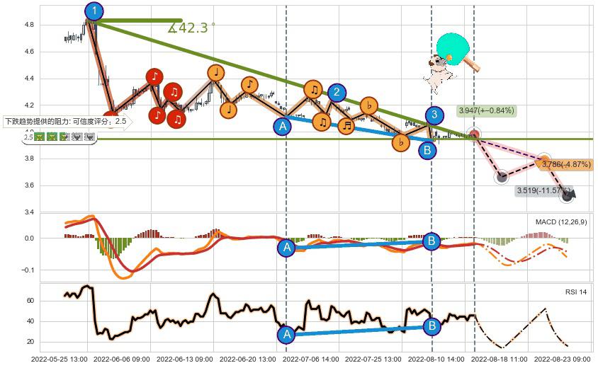 ➣ 预测:2022-08-19 12:00,【试探阻力】稳定目前下跌趋势的前提下,预测价格:3.786
