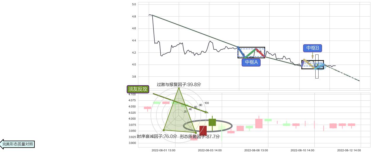 从2022-08-02 13:00至2022-08-12 14:00,共包含18个小时,阶段股价上涨1.28%,阶段股价变动位移路程比: 1 : 4