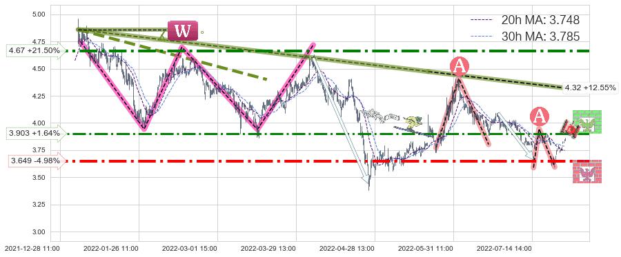 ♘ 阻力价格位3.903,可信任强度60.65%,距离最后交易2022-08-12 14:00形成的收盘价格3.840相差 +1.64%