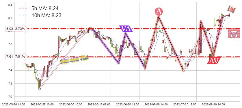 ♘ 支撑价格位7.61,可信任强度69.84%,距离最后交易2022-08-12 14:00形成的收盘价格8.26相差 -7.91%
