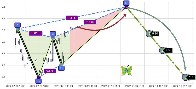 ➣ 未完成【蝴蝶】形态起点X: 06-30:14, 已到达C点: 08-02:14, 预测最终D点: 09-19:14, 共108交易小时