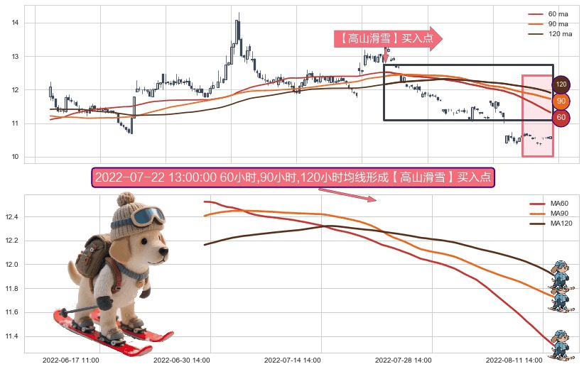 ⚀ 2022-06-30 13:00:00小时-2022-08-12 14:00:00小时显现 60小时-90小时-120小时均线 【高山滑雪】买入点 看多信号,后市看涨,买入