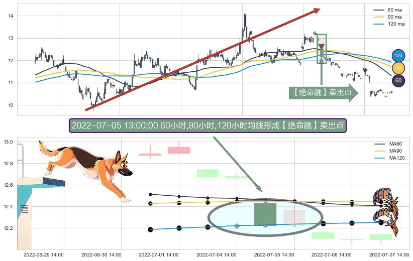 ⚀ 2022-07-05 13:00:00小时显现 60小时-90小时-120小时均线 【绝命跳】卖出点 看空信号,后市看跌,卖出