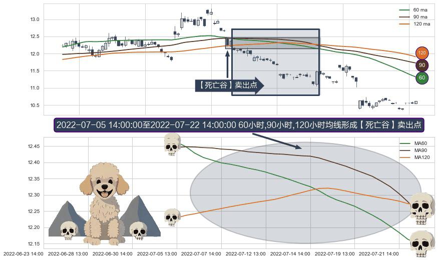 ⚀ 2022-07-06 13:00:00-小时至2022-07-22 14:00:00-小时显现 60小时-90小时-120小时均线 【死亡谷】卖出点 看空信号,后市看跌,卖出