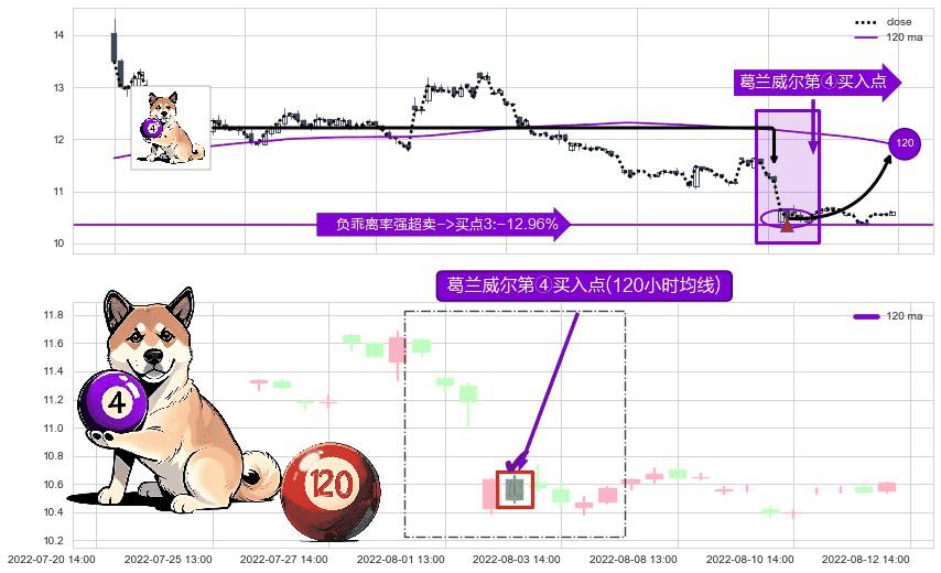 ⚀ 2022-08-02 14:00:00-小时显现 葛兰威尔均线 120小时均线 第④买入点 下降趋势均值回复的短线反弹信号,后市看涨,买进信号