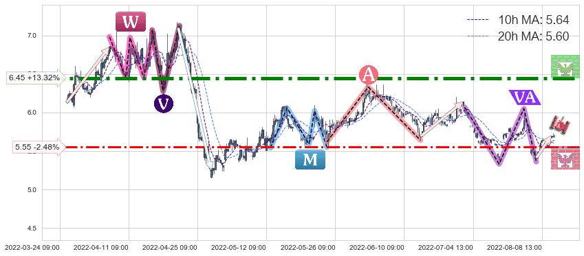 ♘ 支撑价格位5.55,可信任强度56.63%,距离最后交易2022-08-12 14:00形成的收盘价格5.69相差 -2.48%