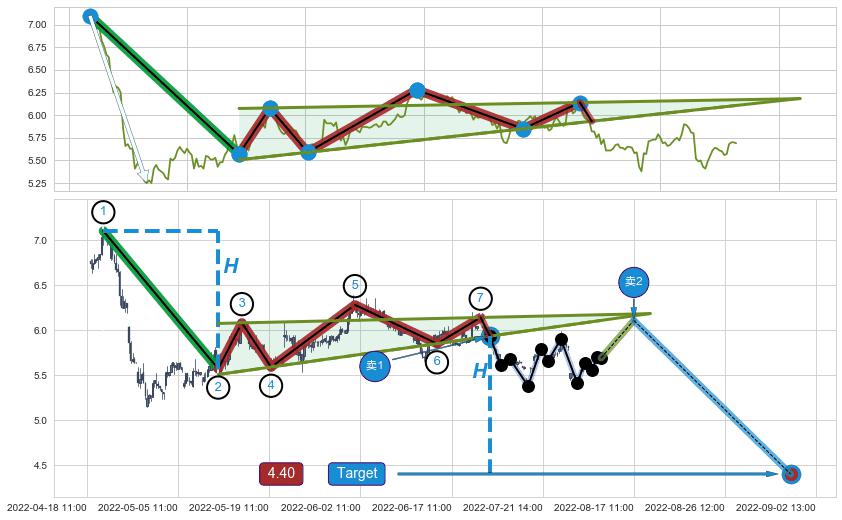 | 5 🅚:下跌抵抗 ➕ 📐:升楔型下行突破支撑位破位, 猜想持续下沉下跌,被突破的支撑位已变为阻力位 ☞ 看空信号 ⇥ 【🅚线】交织【图形】⇥ 综合量化分数: 46 | > |