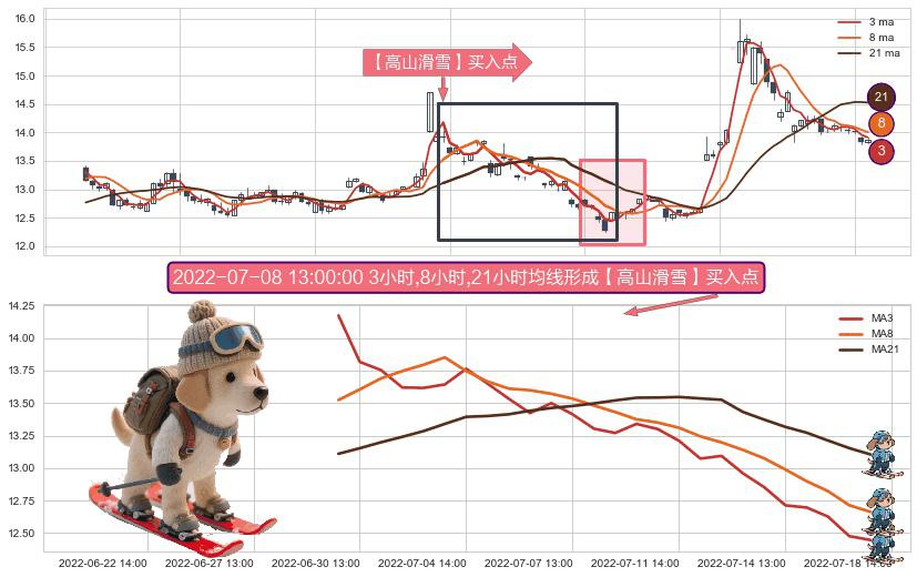 ⚀ 2022-06-29 14:00:00小时-2022-07-18 13:00:00小时显现 3小时-8小时-21小时均线 【高山滑雪】买入点 看多信号,后市看涨,买入