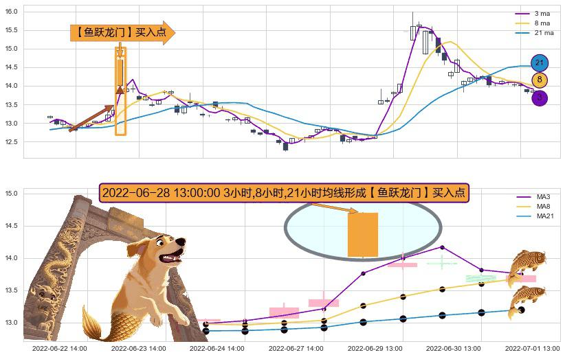 ⚀ 2022-06-28 13:00:00小时显现 3小时-8小时-21小时均线 【鱼跃龙门】买入点 看多信号,后市看涨,买入