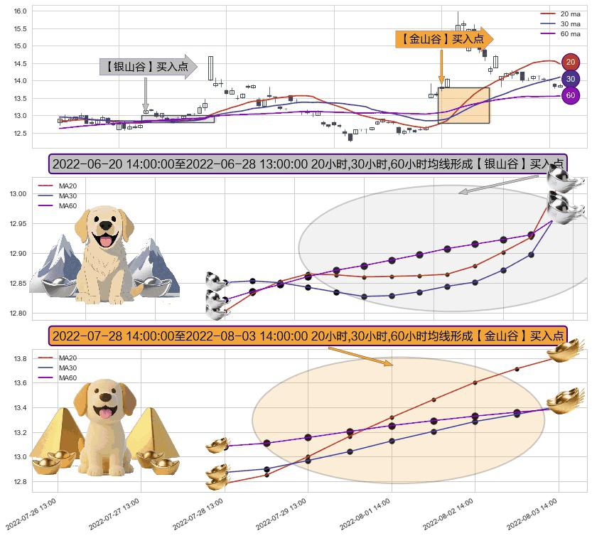 ⚃ 2022-07-29 13:00:00-小时至2022-08-03 14:00:00-小时显现 20小时-30小时-60小时均线 【金山谷】买入点 其再次确认了买入信号,可靠性更强,买入