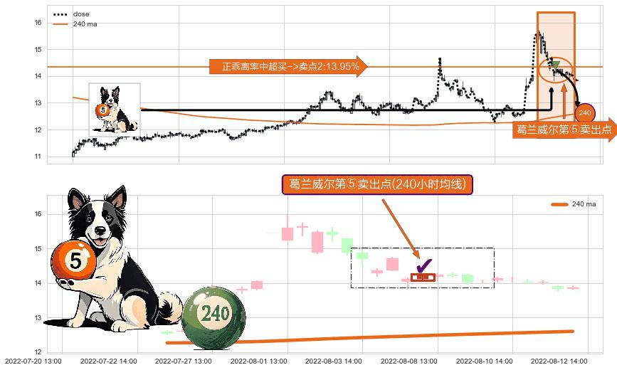 ⚀ 2022-08-05 14:00:00-小时显现 葛兰威尔均线 240小时均线 第⑤卖出点 上升趋势均值回复的短线回落信号,后市看跌,卖出信号