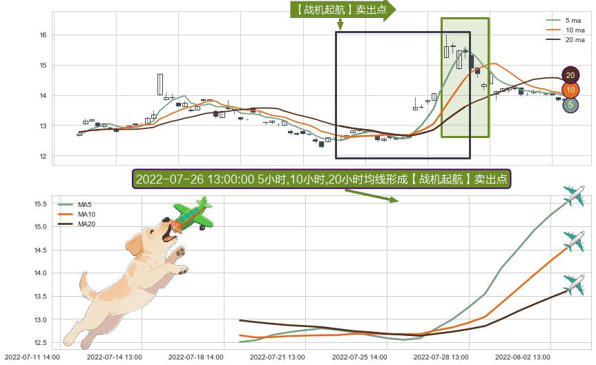 ⚀ 2022-07-19 13:00:00小时-2022-08-02 14:00:00小时显现 5小时-10小时-20小时均线 【战机起航】卖出点 看空信号,后市看跌,卖出