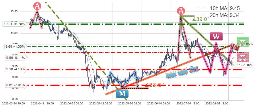 ♘ 阻力价格位9.69,可信任强度44.63%,距离最后交易2022-08-12 14:00形成的收盘价格9.57相差 +1.30%