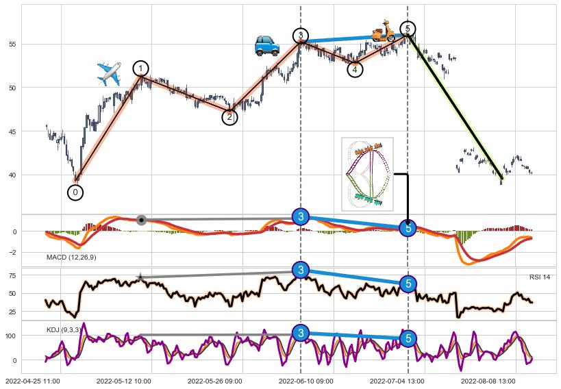 ➣ 1,3,5驱动浪MACD, RSI, KDJ走势都出现【常规背离】反转信号增强