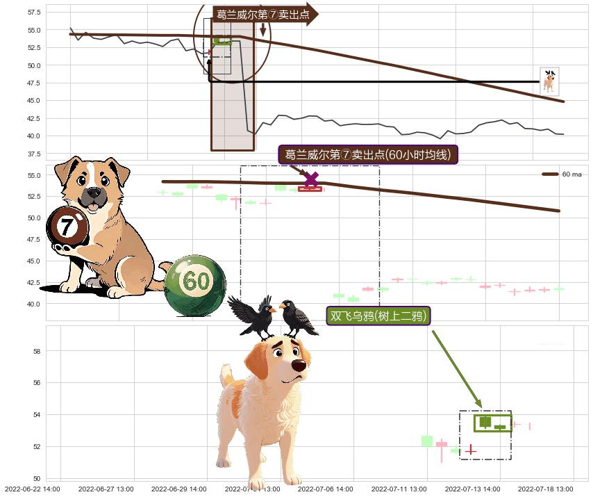 从2022-06-27 14:00至2022-08-08 13:00,共包含60个小时,阶段股价下跌-24.97%,阶段股价变动位移路程比: 1 : 3,下跌趋势角度: 22.6,2022-07-15 13:00向↘︎形成缺口,跳空下跌-23.73%˚
