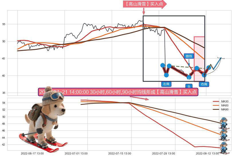 从2022-06-15 13:00至2022-08-12 14:00,共包含92个小时,阶段股价下跌-27.59%,阶段股价变动位移路程比: 1 : 3,2022-07-15 13:00向↘︎形成缺口,跳空下跌-23.73%˚