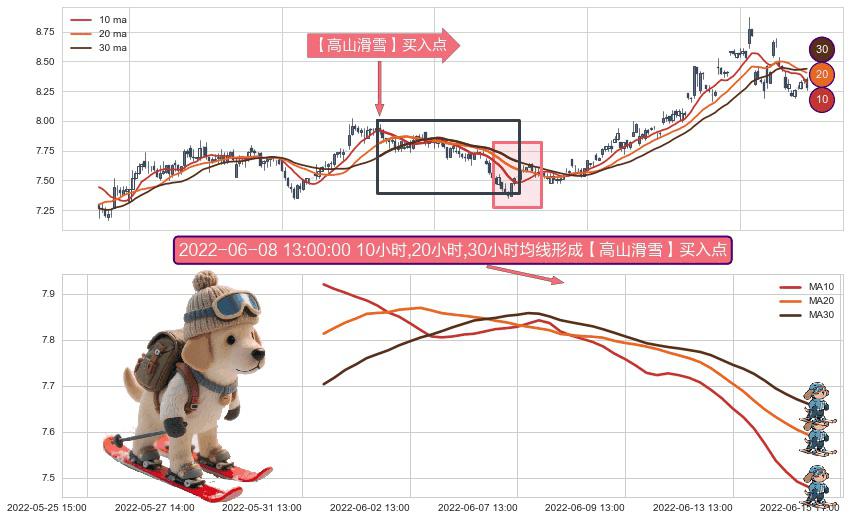 形态多维评估: ⚀ 2022-06-01 09:00:00小时-2022-06-14 15:00:00小时显现 10小时-20小时-30小时均线 【高山滑雪】买入点 看多信号,后市看涨,买入