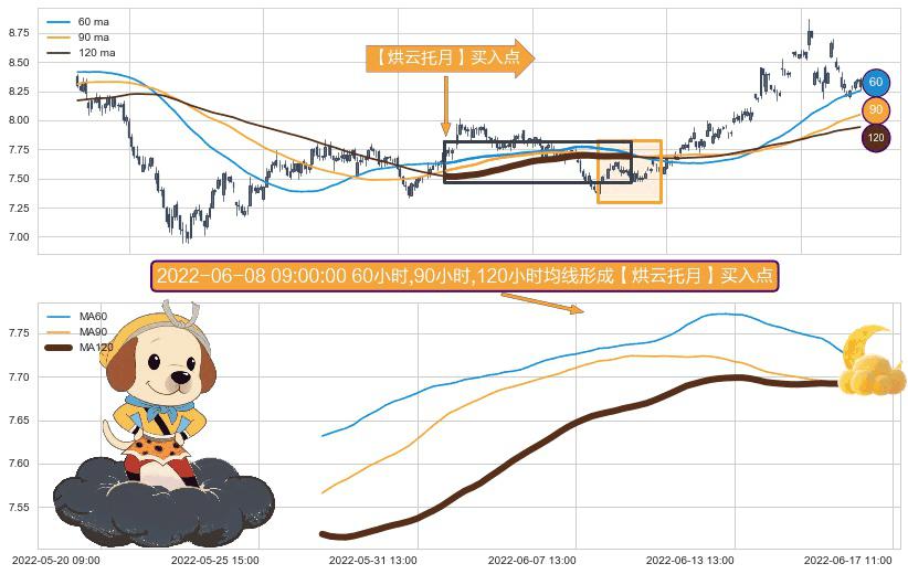 形态多维评估: ⚀ 2022-05-27 11:00:00小时-2022-06-16 13:00:00小时显现 60小时-90小时-120小时均线 【烘云托月】买入点 看多信号,后市看涨,买入