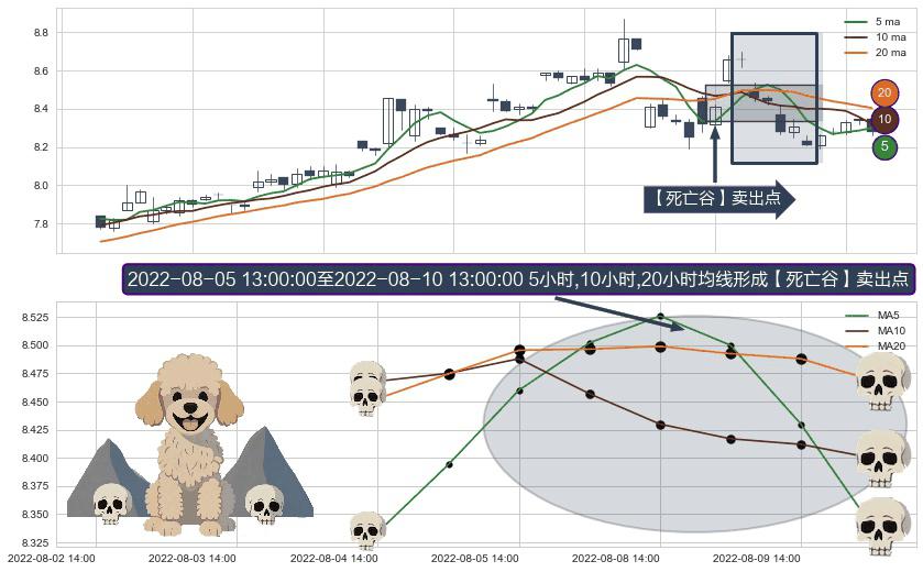 形态多维评估: ⚀ 2022-08-05 14:00:00-小时至2022-08-10 13:00:00-小时显现 5小时-10小时-20小时均线 【死亡谷】卖出点 看空信号,后市看跌,卖出