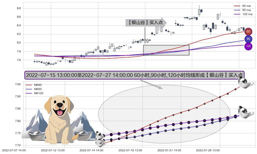 形态多维评估: ⚀ 2022-07-15 14:00:00-小时至2022-07-27 14:00:00-小时显现 60小时-90小时-120小时均线 【银山谷】买入点 看多信号,后市看涨,买入